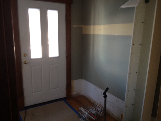End of week 1. A bit hard to see, but the wing walls were framed in on Friday, including lowering of the ceiling. The ceiling was also lowered in the pantry/basement door area, and part of the closet was framed.